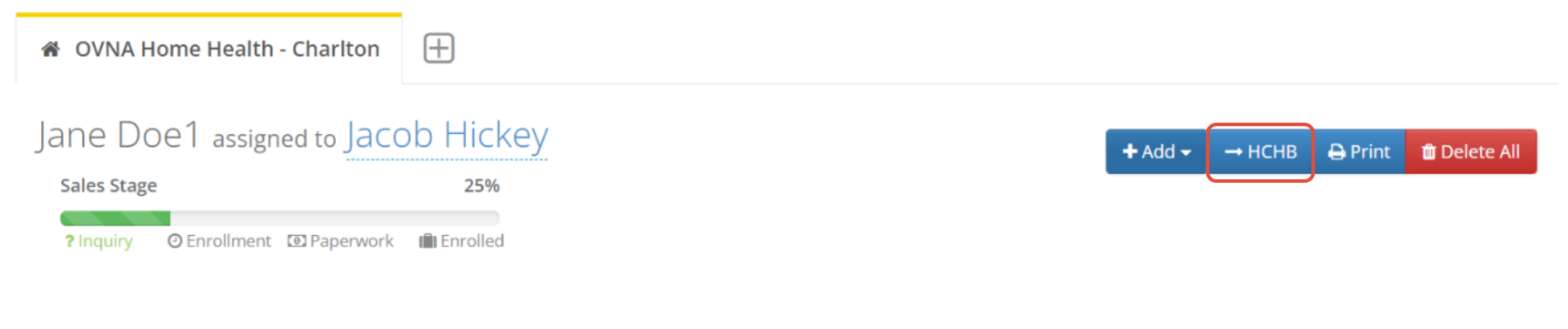 Note: Upon a successful send to Homecare Homebase, the "-> HCHB" button will be removed from the profile to help prevent sending duplicates to Homecare Homebase.