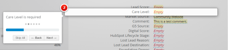 Required fields will dim the screen, drawing attention to the fields your Admin has chosen as required. As each Required field gets filled out, the user will be guided to fill out the remaining Required Fields until all have been filled in. This will happen upon each page visit where Required Fields are empty.