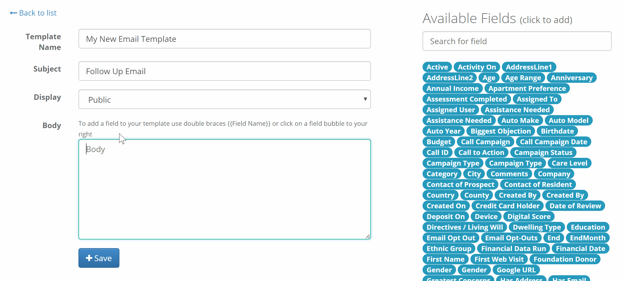 Step 6: The Body text area is where you will put what you want your email to say. You can make these Email Templates smarter and more personal by using fields found on a profile. This is done by putting the field names in curly braces: {{Field Name}} or by clicking the blue bubble(s) containing the field you would like to use on the right side of the create Email Template page. You may also search for fields using the search field above the blue field bubbles.
