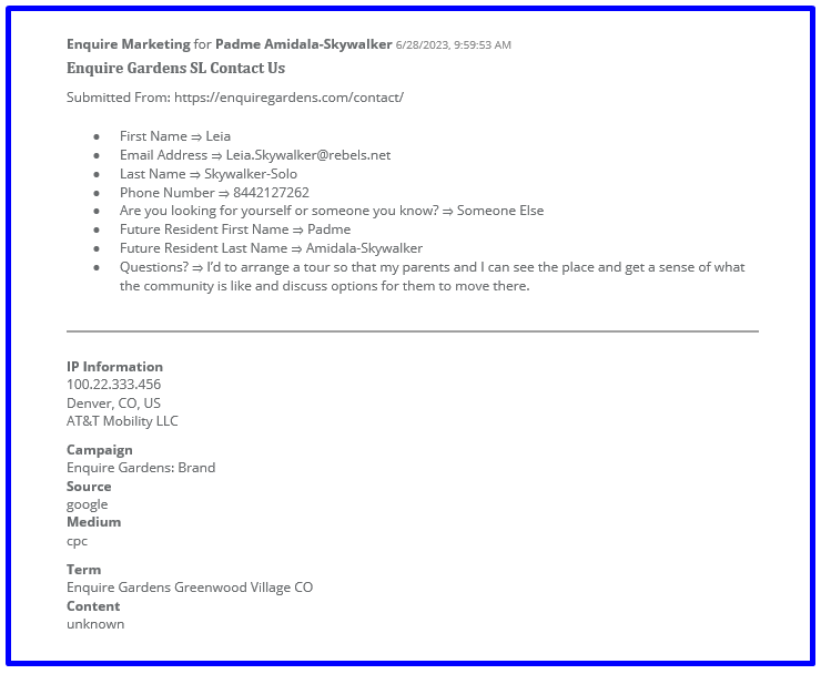 - No additional Questions, instead create a generic prospect using inquiring individuals last name: "Prospect Smith", or with relationship "Mom Smith"