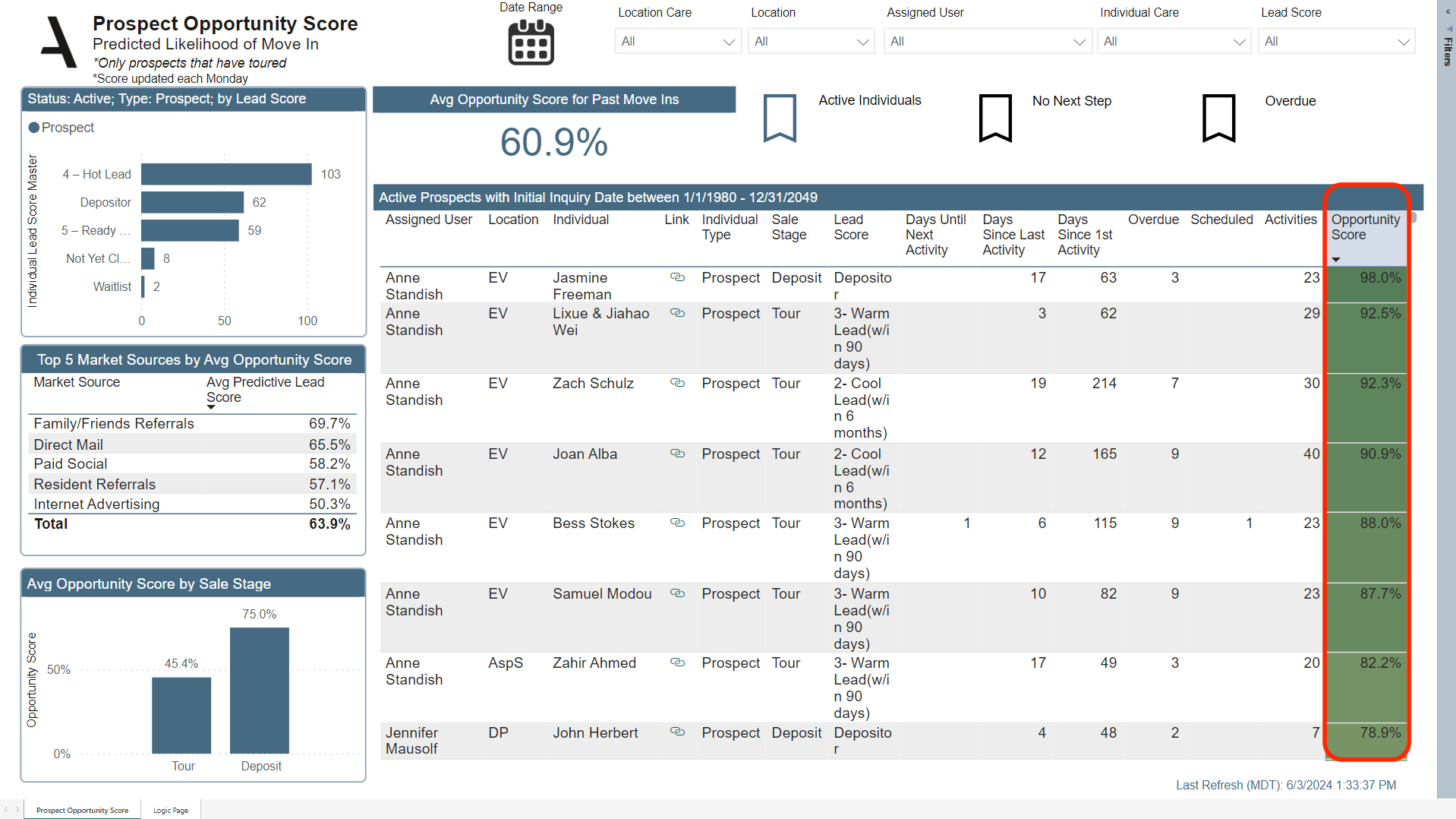 - Have you ever looked at your list of prospects and felt a little lost for who to call first? Instead of subjectively judging a prospect’s readiness, prospect opportunity scoring uses the power of machine learning to help you focus on the prospects who are the most likely to become residents.