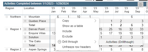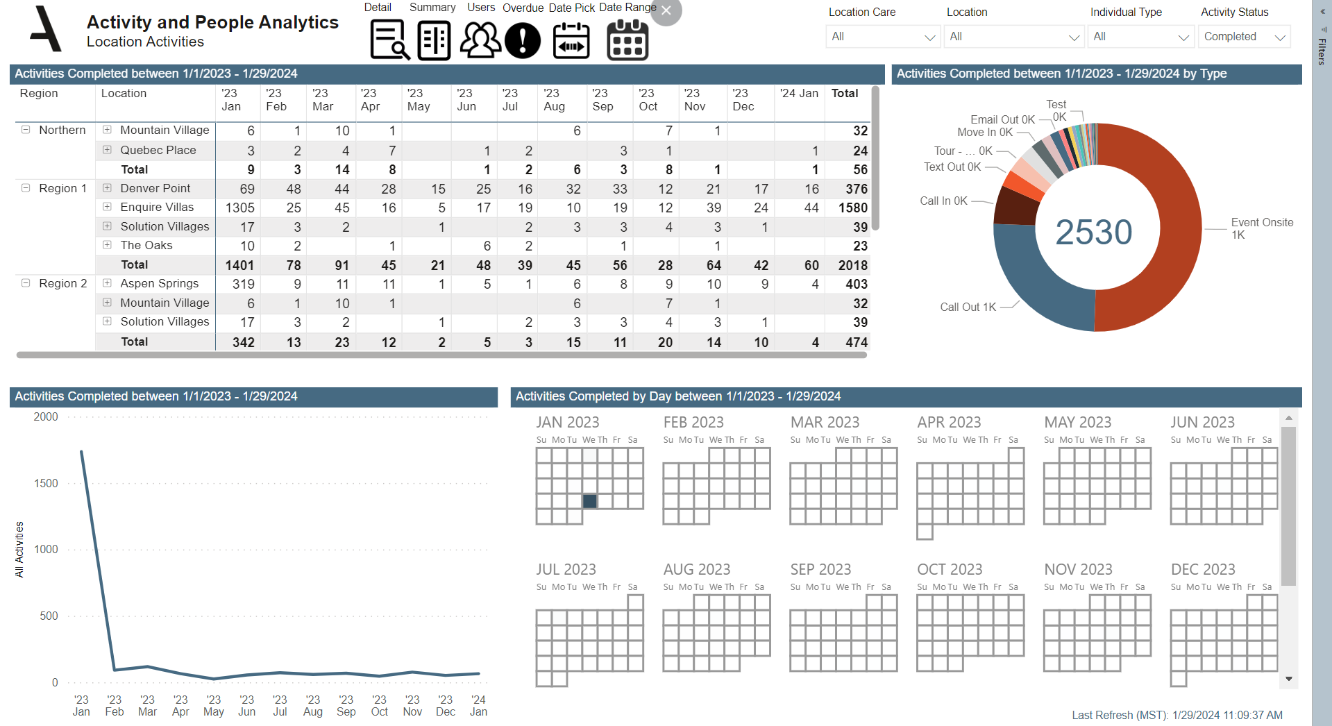 The activities completed section on the activities tab will give an overview on all completed activities during the date filtered by region, location and date. A user can right click on a number to drill through to see the list of individuals listed for that section.