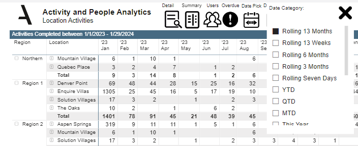 The report date will default to rolling 13 months, this can be changed under the Date Pick section or the Date Range section.