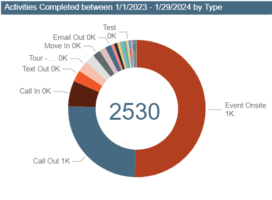The activities completed by type chart shows all activities that have been completed during the date filtered based on the type of activity. When this section is clicked on, it will manipulate the report to show only what activity type was clicked on. For example, if Event Onsite was clicked on, this will manipulate the report to show data for that activity type.