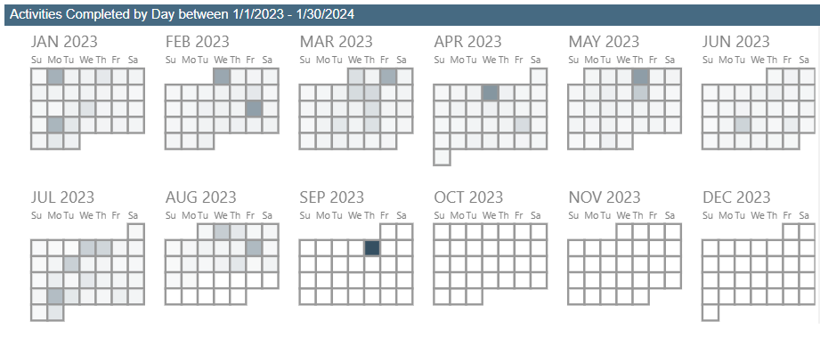 This section will show all completed activities based on the month and date. The darker the color the higher amount of activities were completed on that date. This section is a great view to see productivity based on month and date.