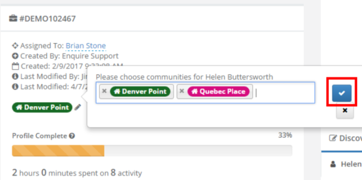 Step 5: To remove communities that an individual is tagged to, click the small pencil icon, click the small grey 'X' next to the community you would like to remove, and then click the blue check mark button to save your selection.