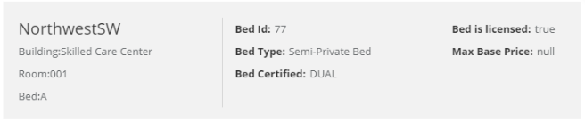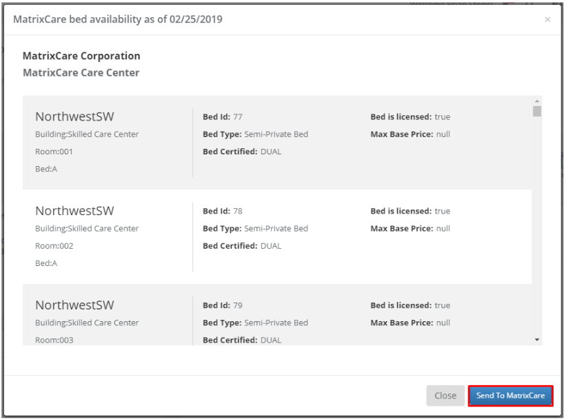 Step 4: A modal will appear displaying the current bed availability based on the care level of the individual and the facility they are admitting to. This bed availability is view only and each bed will have information like it's location and type.