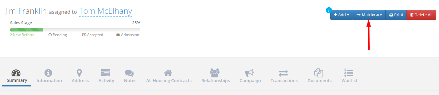 Note: Upon a successful send to MatrixCare, the " MatrixCare" button will be removed from the profile to help prevent sending duplicates to MatrixCare.