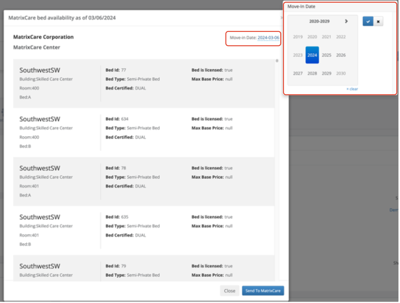 Step 5: Once you have confirmed the bed availability, Set the projected move-in date and click the blue Send to MatrixCare button.