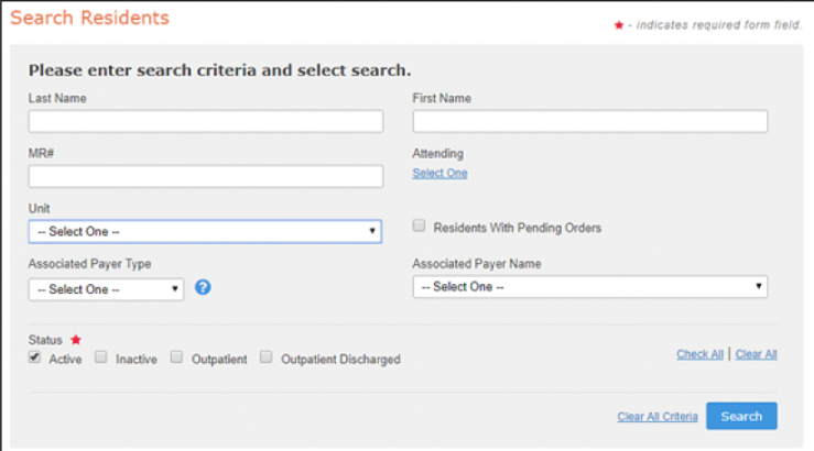 Once the resident has been sent from Enquire, they will now have a Face Sheet and will show up when performing a resident search.