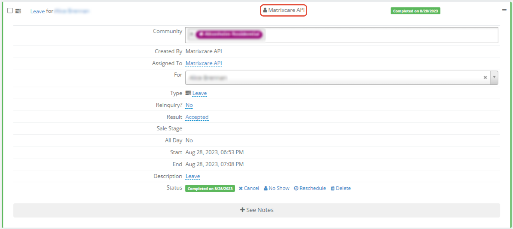 - An Activity Type of Leave