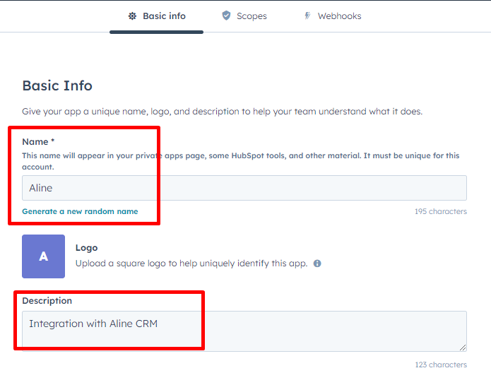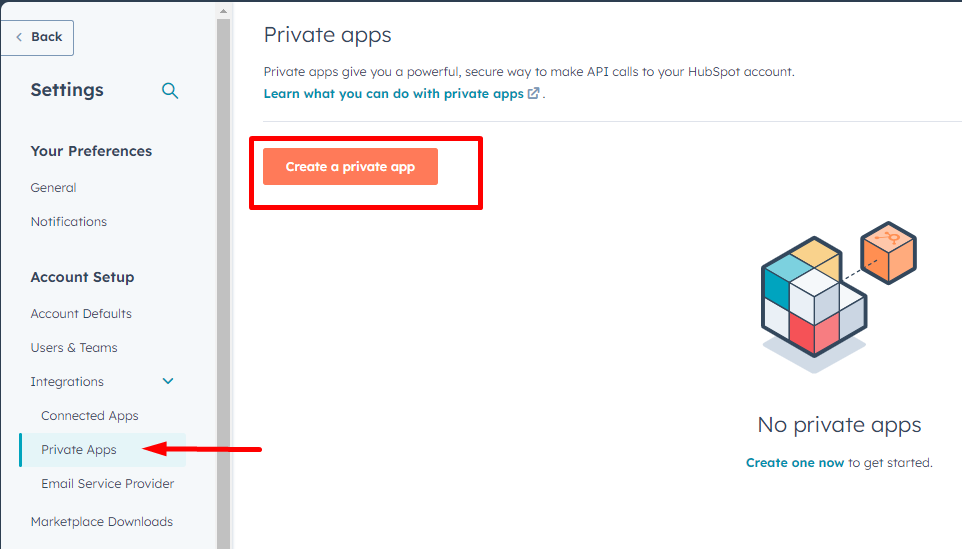 Navigate to HubSpot Settings -> Integrations -> Private Apps > Click Create A Private App (Example Pictured);