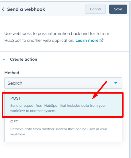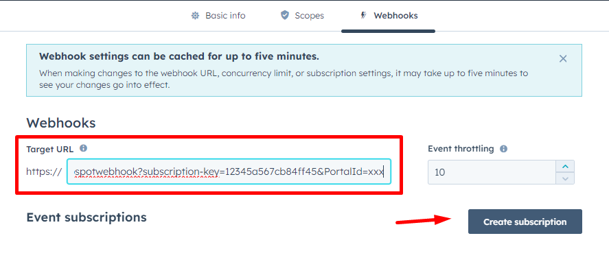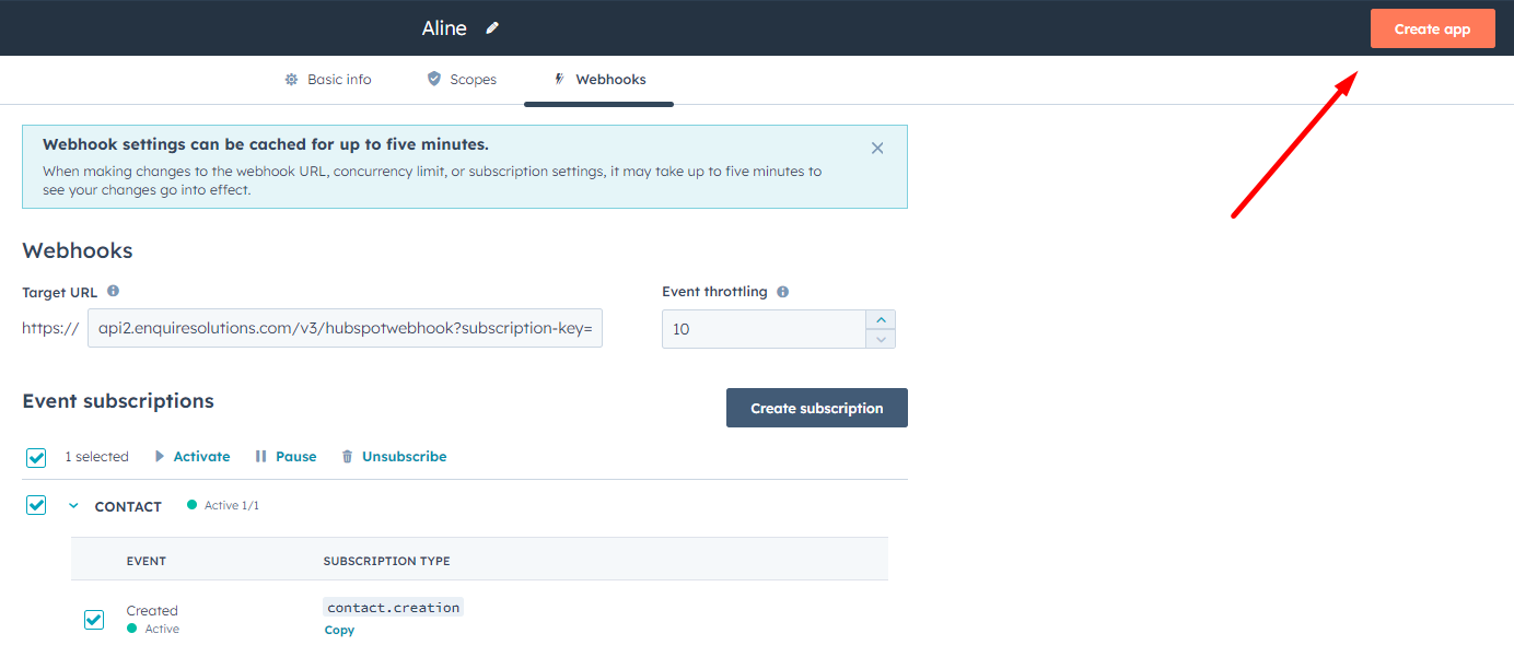 Click Webhooks tab > Create and add the Webhook Target URL of: https://api2.enquiresolutions.com/v3/hubspotwebhook?subscription-key=12345a567cb84ff45&PortalId=xxx (where the subscription-key=Your Primary API 3.0 Subscription Key; and PortalId=Your Enquire Portal Id)