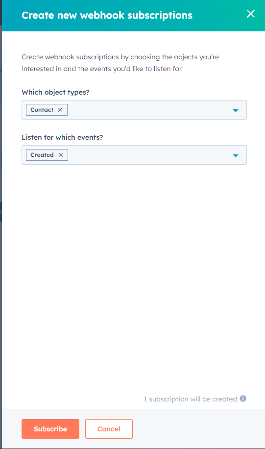 Click “Create Subscription” > Webhook Subscription = Contact & Which Events = Created > “SubScribe” button
