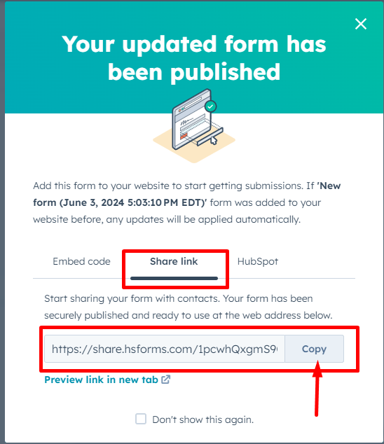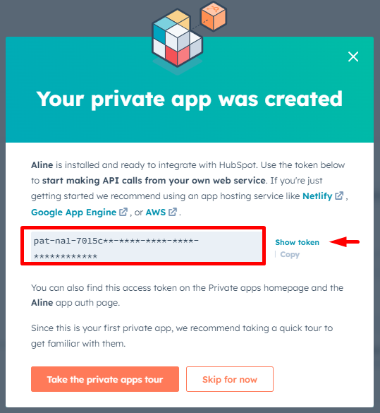 3. Get your portal ID - After clicking “create a private app” copy the URL to send to Aline. The number shown in the URL is your HubSpot Portal ID