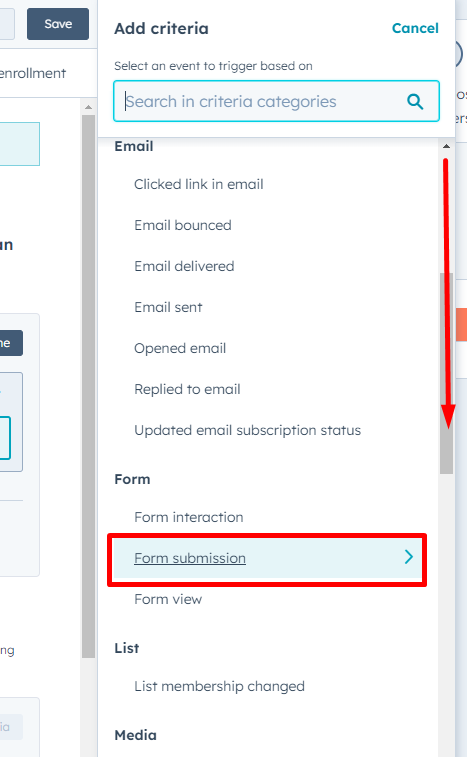 6. In the center below “Add Criteria”, scroll down and select Form Submission.