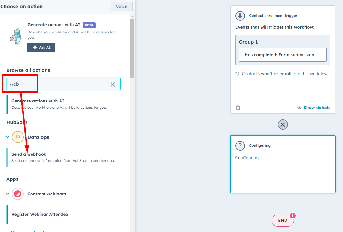 9. In the Browse all actions search bar type “Web” and then select Send a webhook.