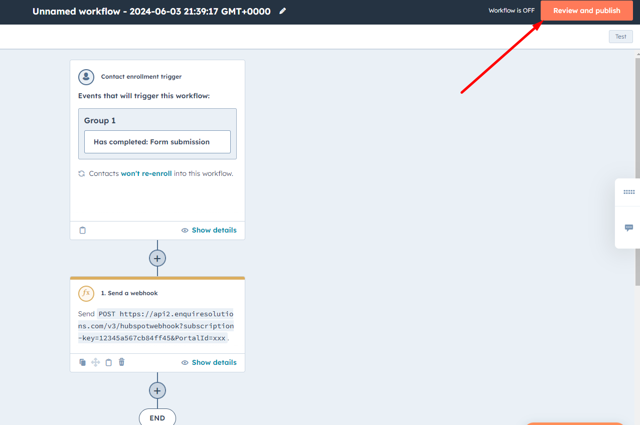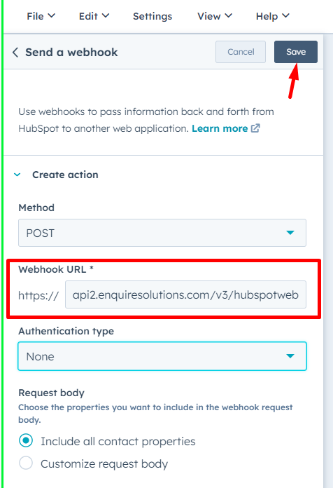 11. Now add the CRM webhook URL = https://api2.enquiresolutions.com/v3/hubspotwebhook?subscription-key=12345a567cb84ff45&PortalId=xxx (where the subscription-key=Your Enquire Primary API 3.0 Key; and PortalId=Your Enquire Portal Id) and then Save