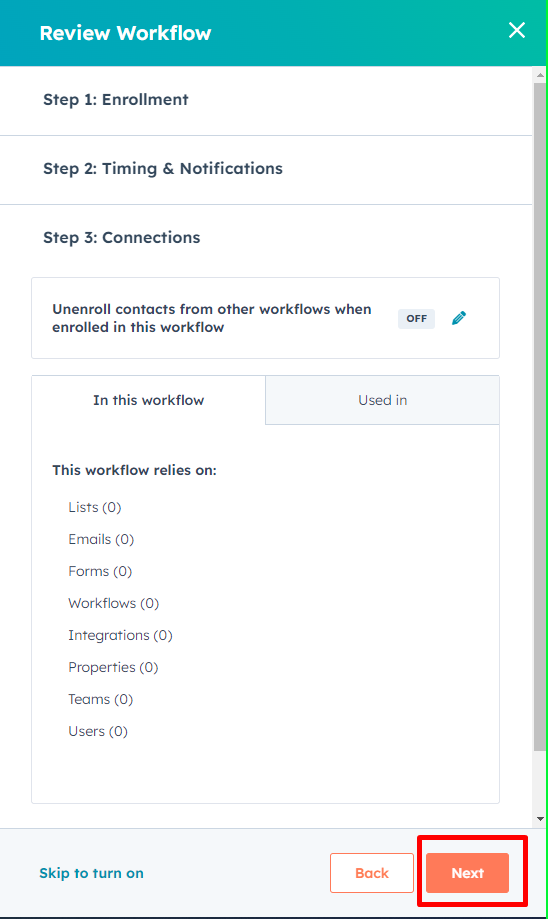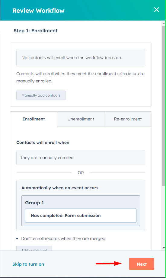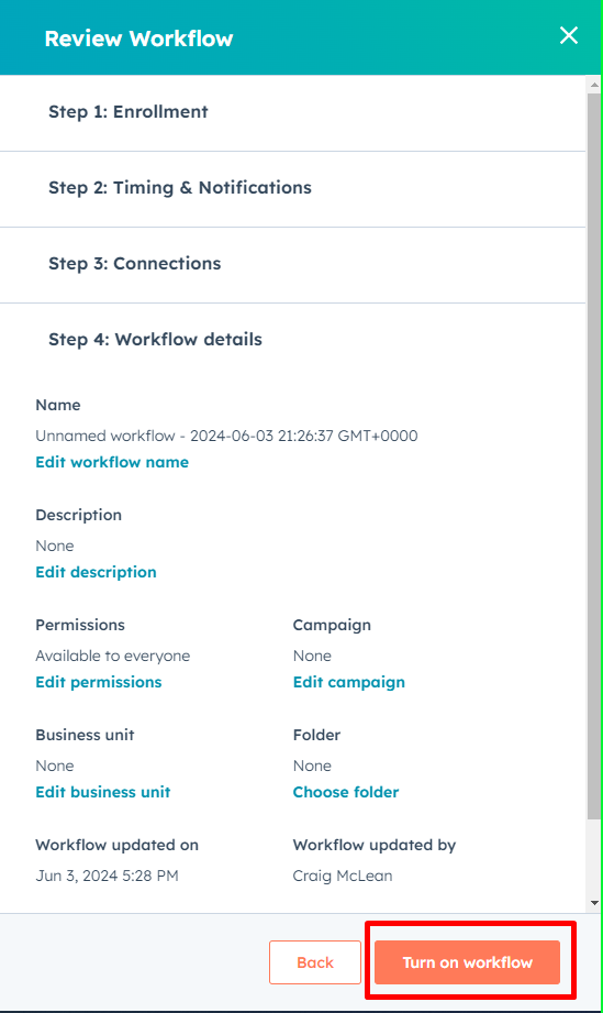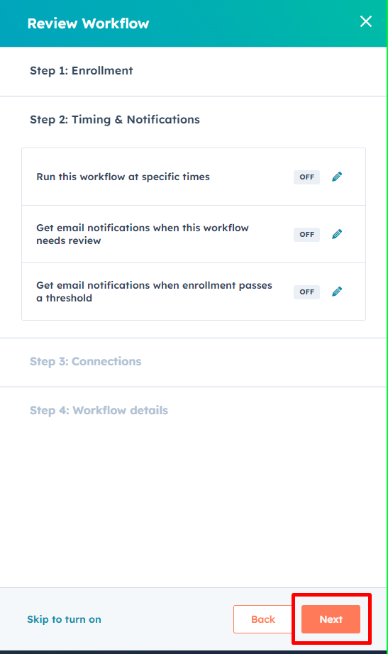 13. Then “next” through the Enrollment tabs and click Turn on Workflow.