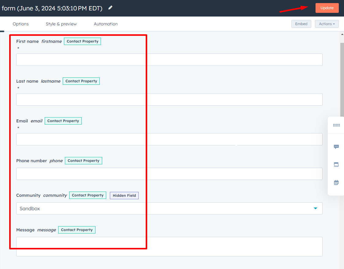 * Community (community), required - can be hidden field in transmission or selectable on corporate page (Custom property within HubSpot)