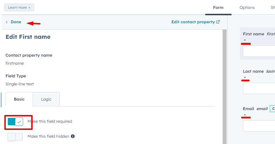 6. Ensure the First name, Last Name and Email are set to Required fields