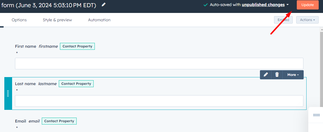 8. Once all fields are added and modified click the “Update” button., then “Publish”.