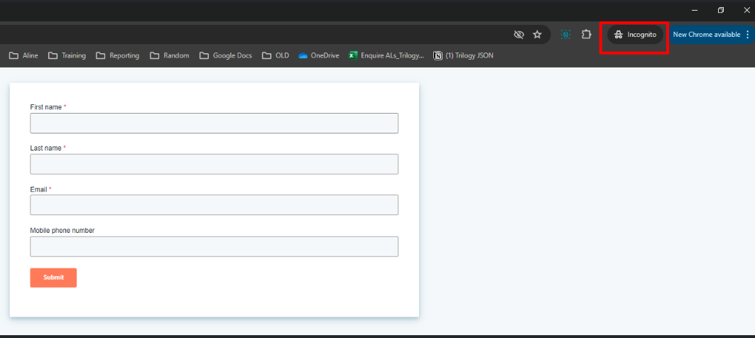 Open the URL in a new incognito window. (best to close all incognito windows and re-paste link for each test submission, or profile within HubSpot will be updated rather than creating new.