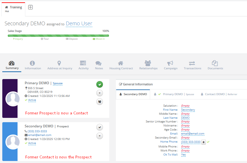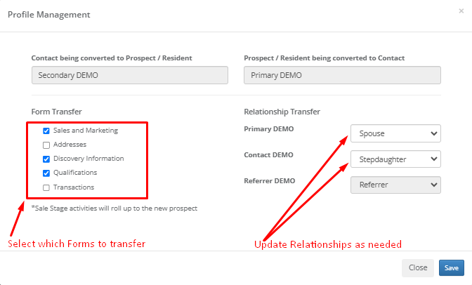 The Profile Management feature allows users the ability to transfer data between individuals on the record. For example, when needing to swap the Prospect with the Contact on the same profile.