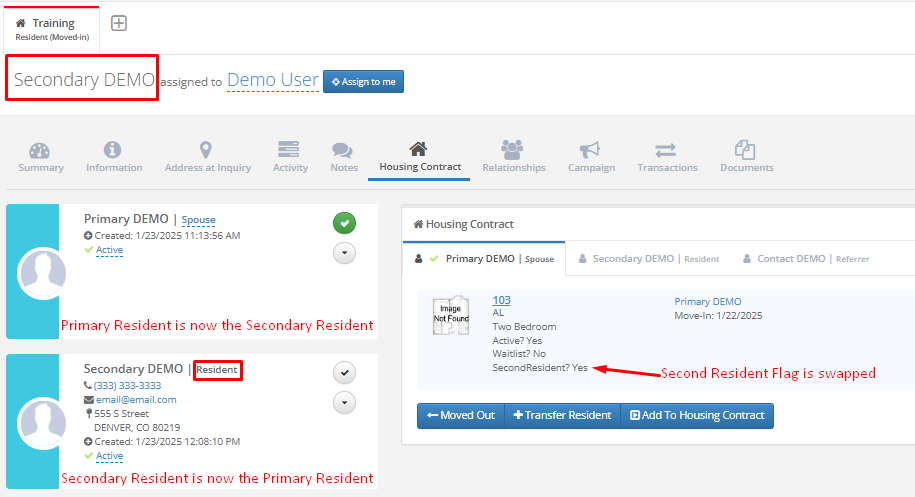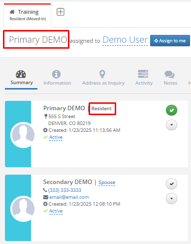 NOTE: The Primary Resident is the Individual that Displays at the top of the Profile and has the Resident designation on the business card. The Co-Resident is the Individual who has the relationship type next to his or her name.