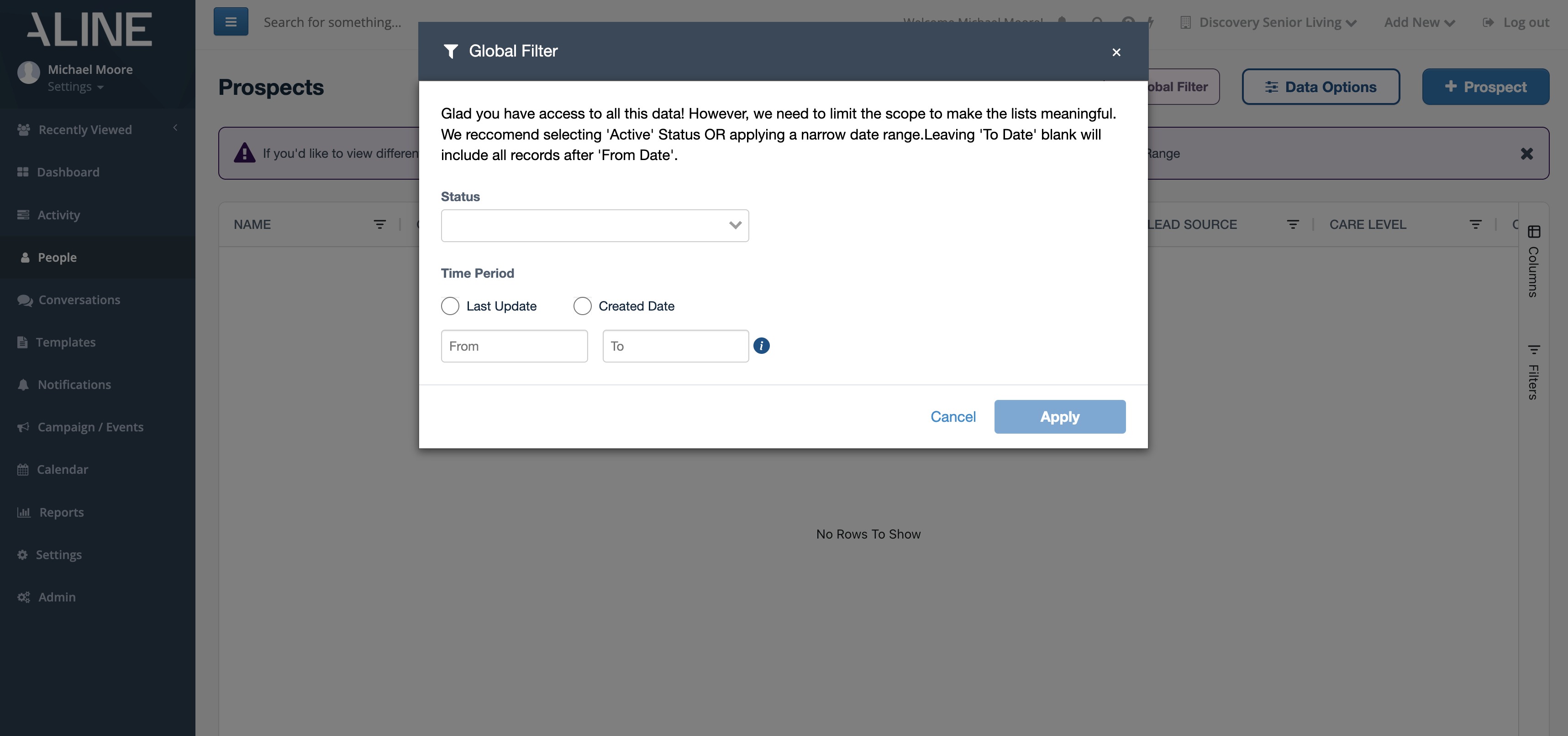 - The Global Resident Filter displays for Prospect searches that exceed 150,000 results and allows users to filter results by both active/inactive status and by date range.