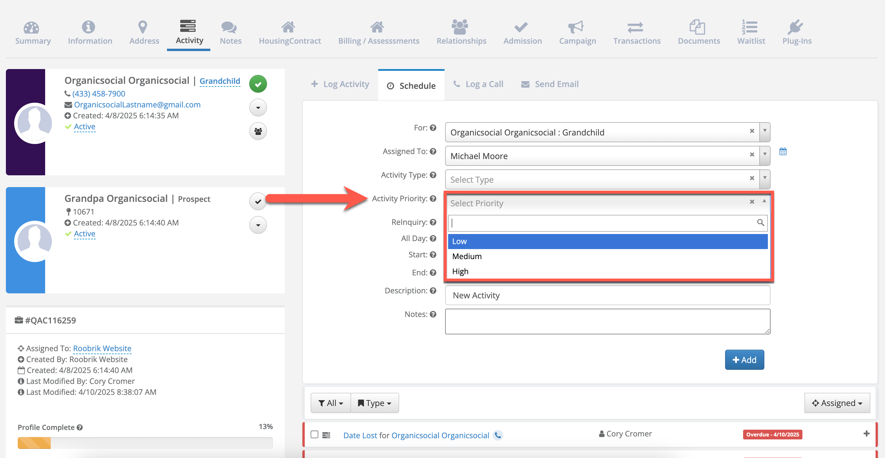 Scheduled activities now include an optional Activity Priority field wherein users can define priorities such as low, medium, and high. Activity Priority types are customizable.