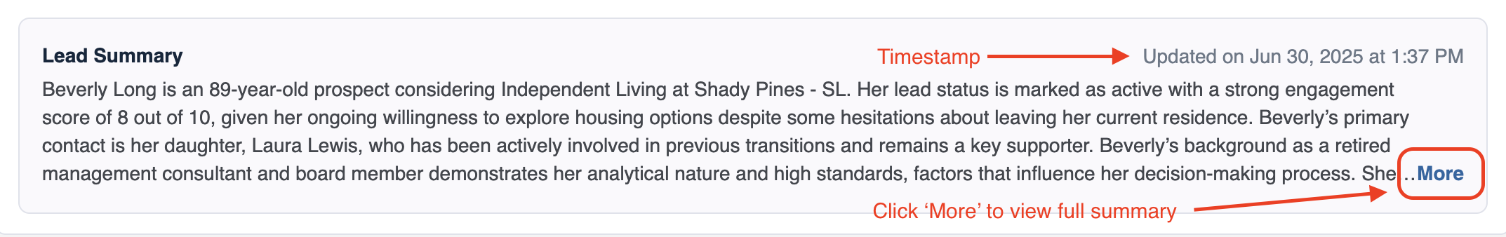 Step 2: Once loaded, the summary will be displayed with the timestamp the Lead Summary was last updated. To view the full summary, click More:
