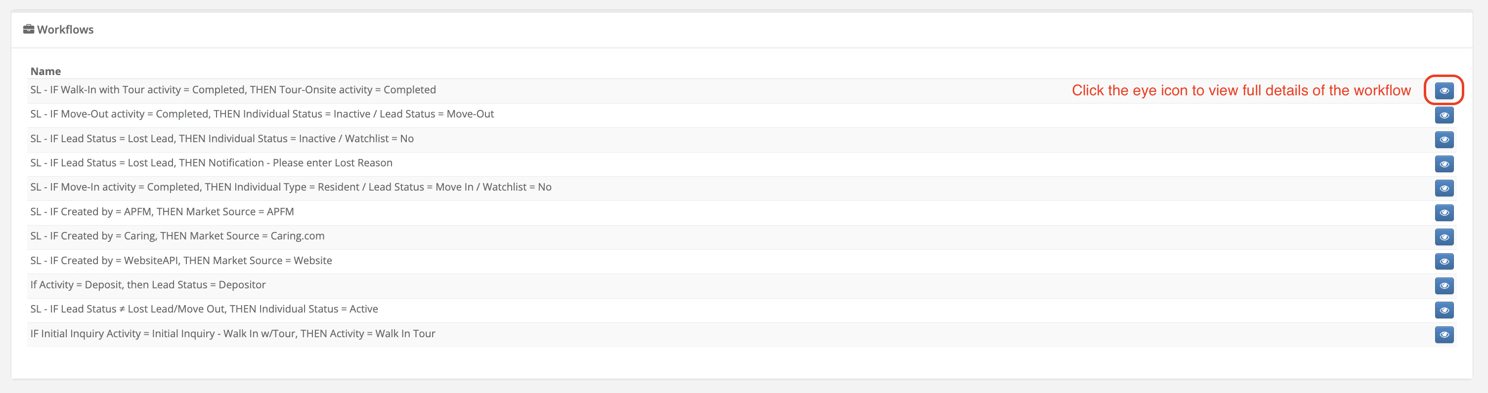 Step 3: To view a particular workflow, select the eye icon on the right-hand side of the desired workflow.