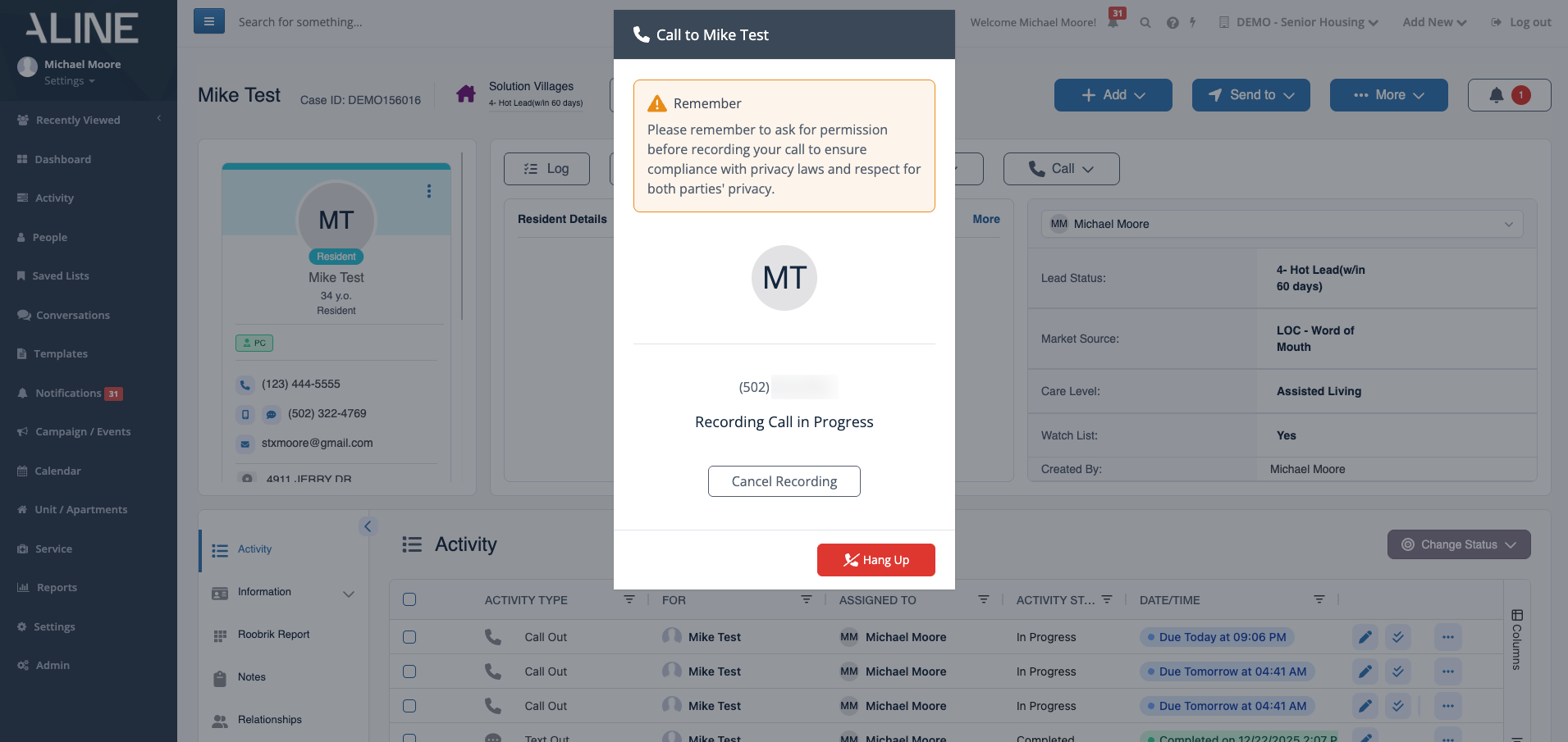 Step 3: Aline CRM will then dial the selected number and the phone call widget will appear onscreen. The call will connect and be conducted as per usual. Aline CRM will record the call's content unless Cancel Recording is selected. To end the phone call, you can select the red Hang Up button.