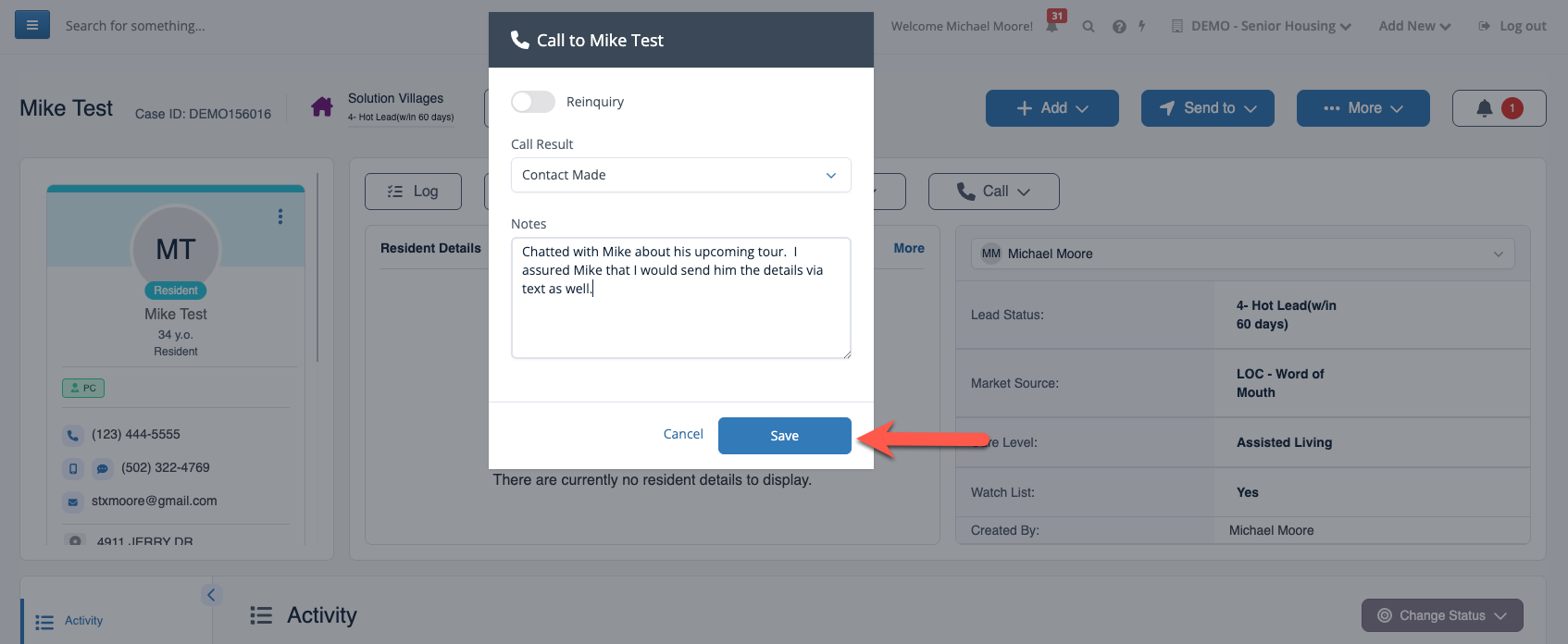 Step 4: After completing the call, additional details can be collected including the Call Result, any additional notes about the phone call, and whether the call was a reinquiry or not. Select Save to save the additional details.