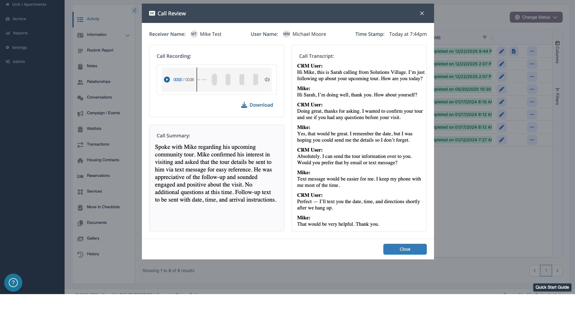 Selecting the Clipboard Icon on the phone call activity will display the call details including the call recording that can be played back ( and is also available for download), an automated call summary, and the call transcript itself.