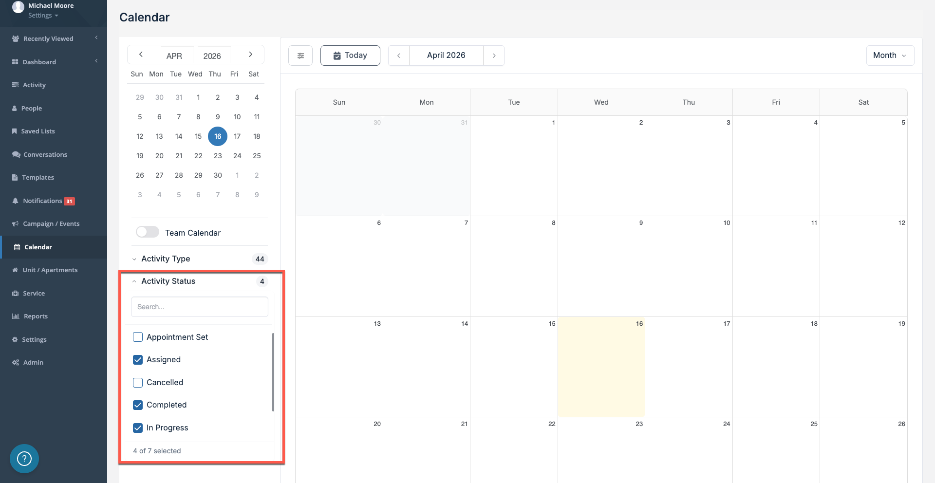 Aline CRM's activity calendar can be filtered in a variety of ways including by activity type, by activity status, by community, and by specific sales users. To interact with the calendar filters, select the Filters Icon.