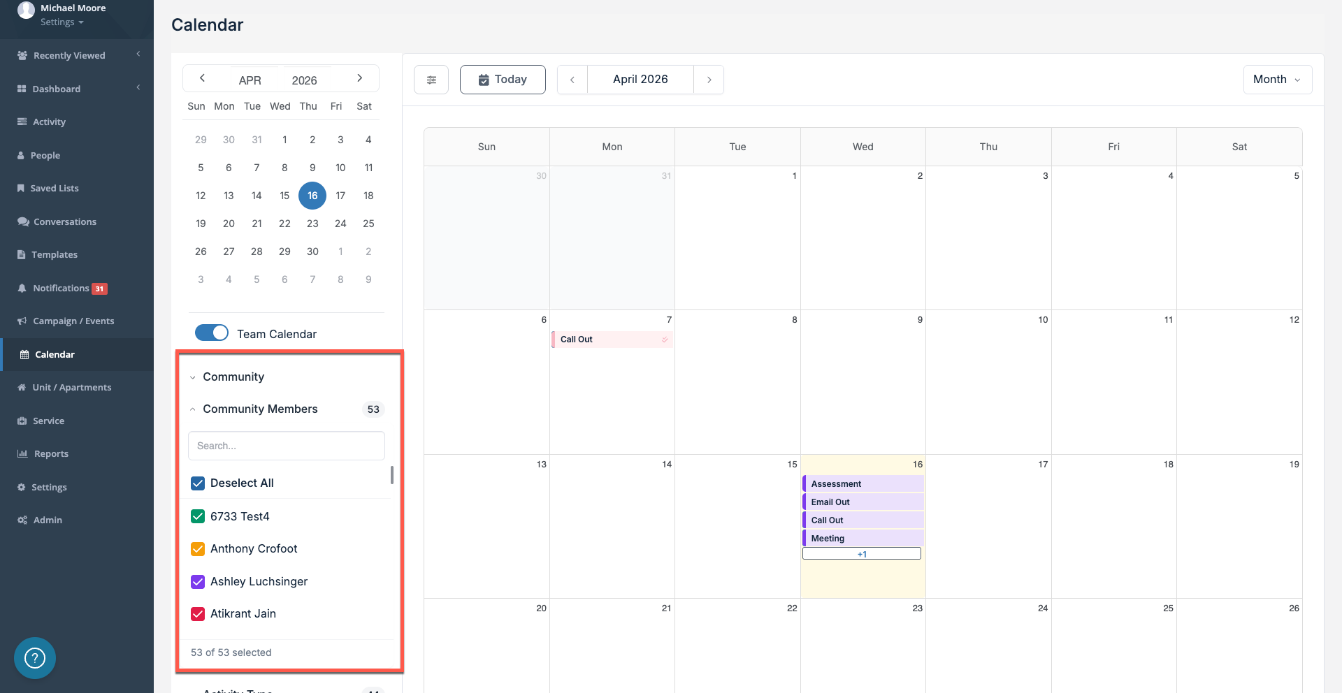 Enable to Team Calendar to utilize Community and Community Member filters. Note that only one Community can be selected at a time. Community Members can be added individually or as a whole.