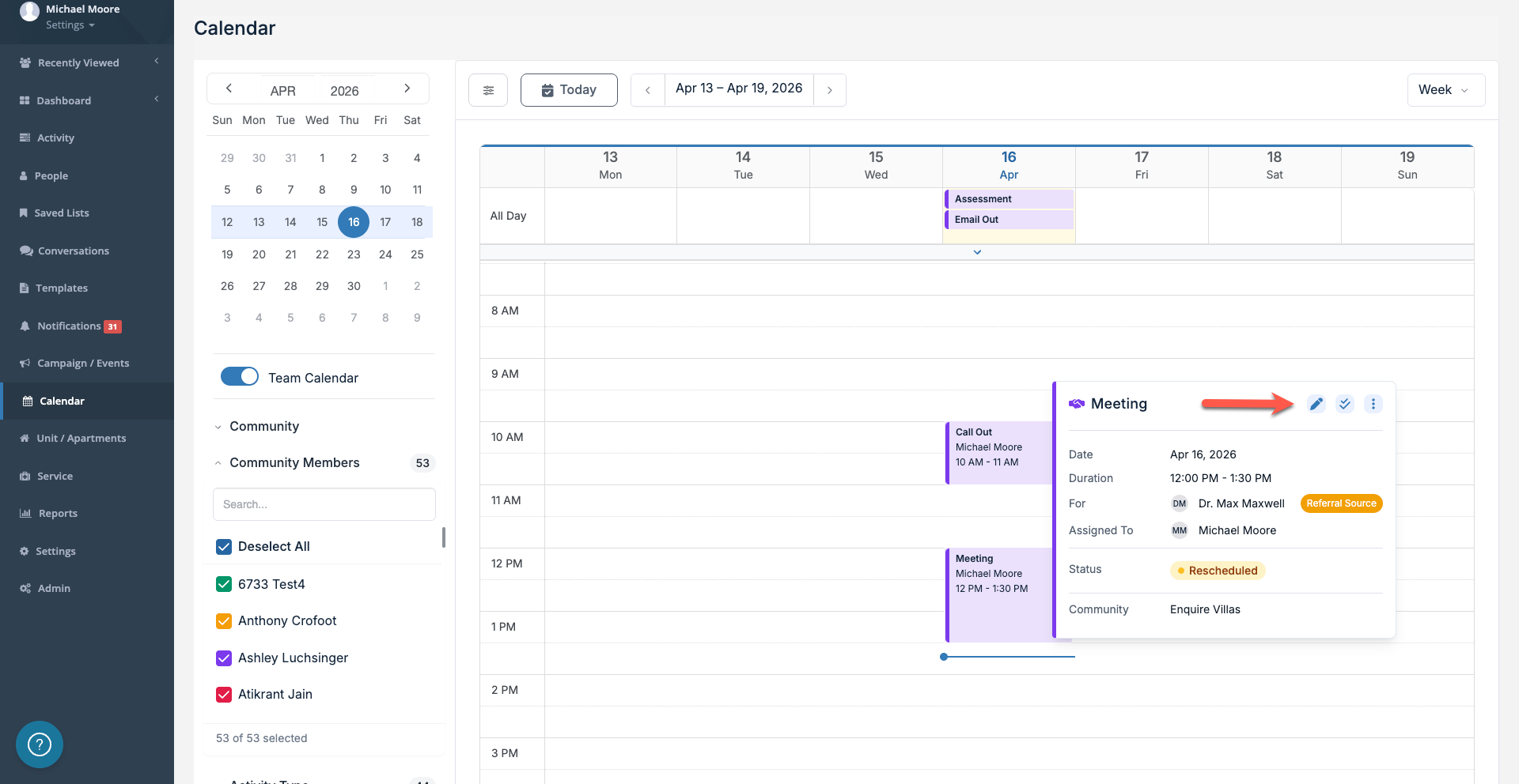 Select the Edit Icon to edit the activity, select the Complete Icon to complete the activity, or select the Three-Dots Icon to reschedule, cancel, mark as a no show, or delete the activity.