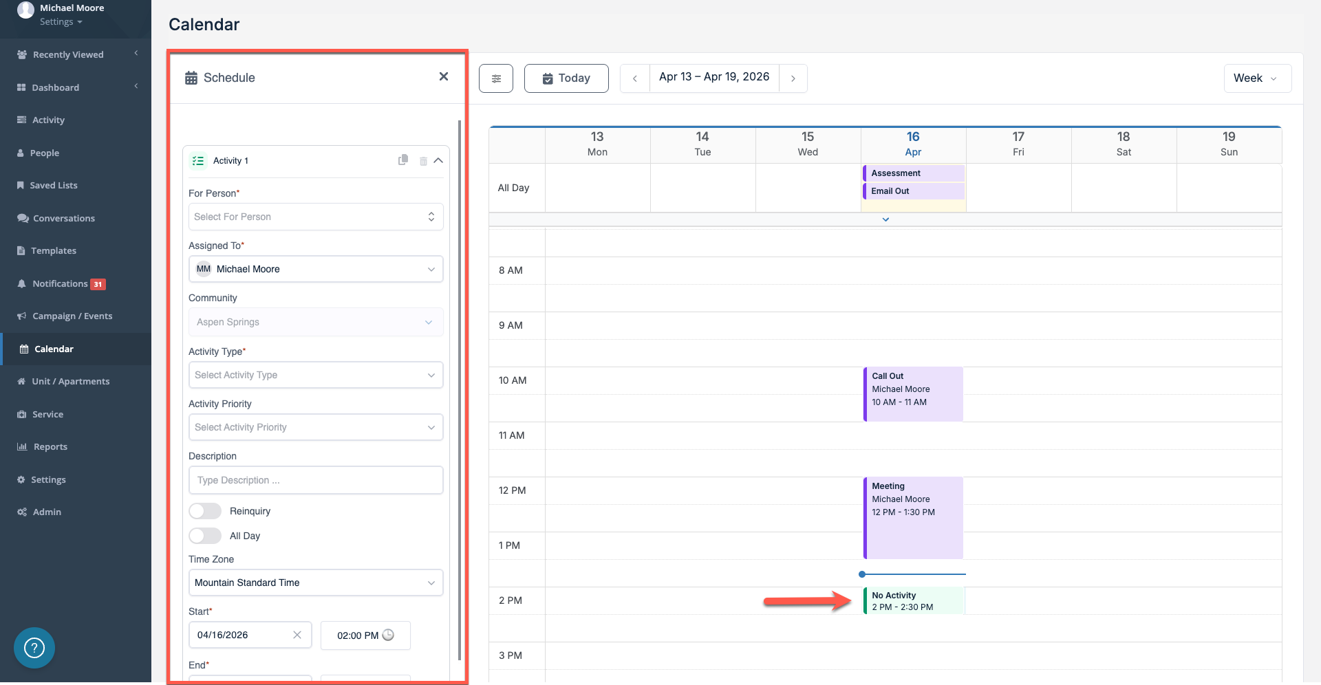On the weekly and daily views, users can select any empty time slot to schedule a new activity. Selecting an empty slot will display the Schedule Activity Window.